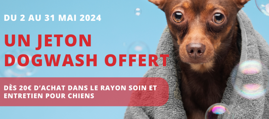Du 1er au 31 mai 2024 : Un jeton DOGWASH offert dès 20 euros d’achat dans le rayon soin et entretien pour chiens